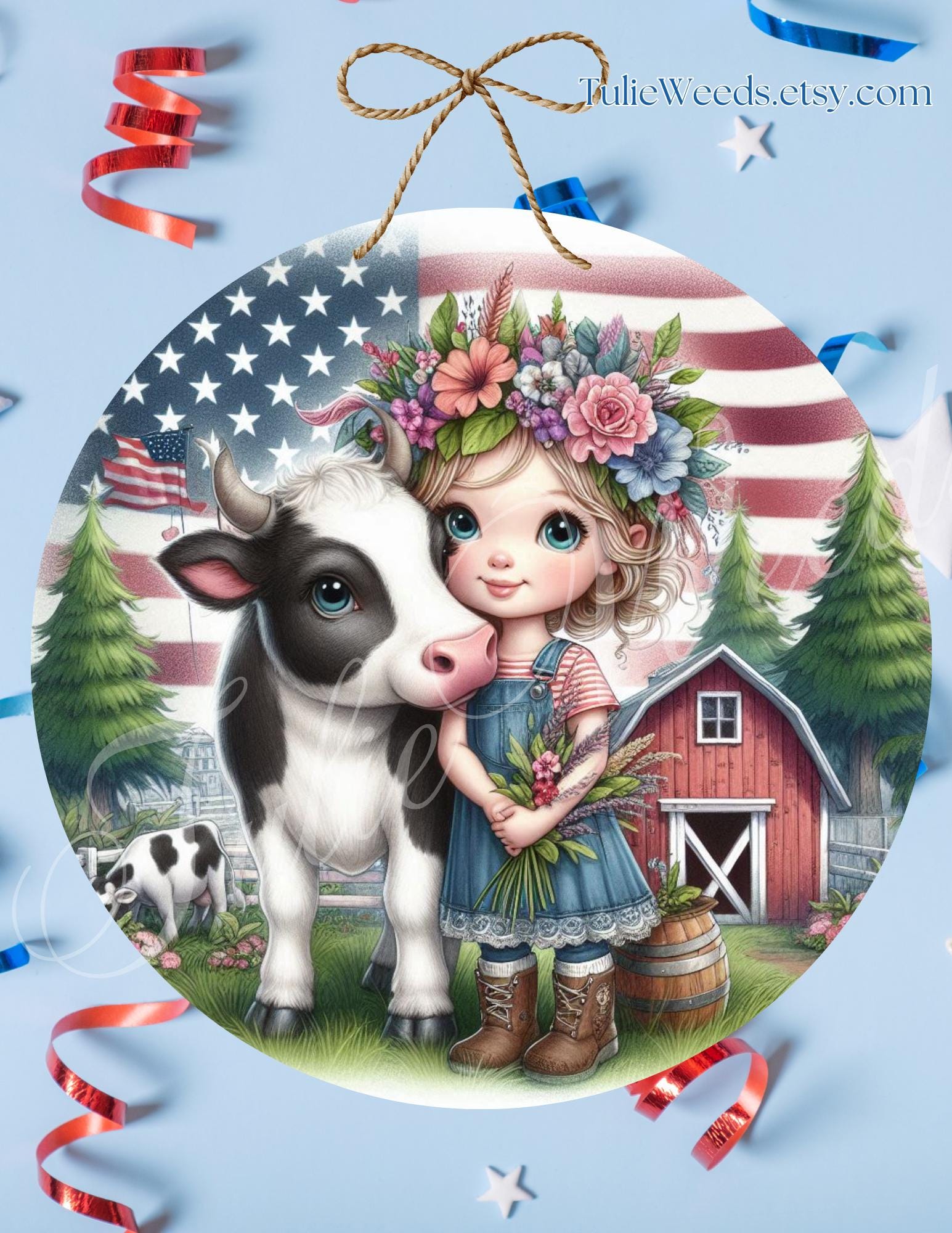 This charming girl and cow door hanger or wall hanger is an ideal addition to any home decor. Can also be used as a wreath center. (there are 2 holes at the top of this sign. ) Featuring a girl and cow with a farm background and an American flag in vibrant colors, it offers a delightful and unique piece of art for any door or wall, making it a great gift idea. The farmland wall hanger is crafted on a 10" x 10" aluminum round, with the picture sublimated for a vibrant and long-lasting finish. The door hanger comes with a rope hanger already placed in two holes on the picture. (You will receive door hanger without watermark)